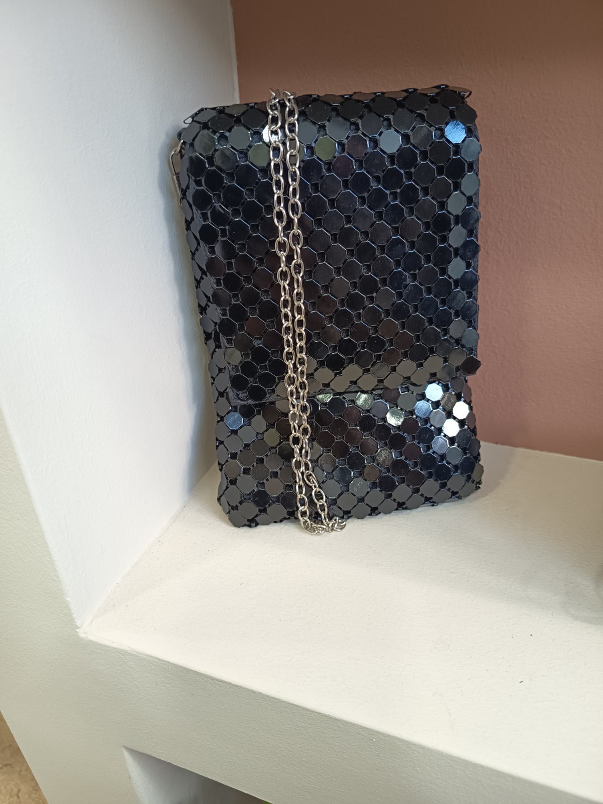 Κομψή μίνι τσάντα ώμου με γυαλιστερές εξάγωνες λεπτομέρειες και ασημί αλυσίδα.